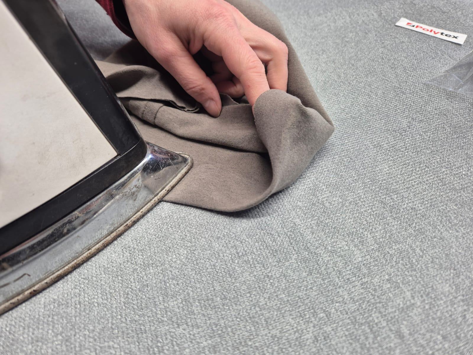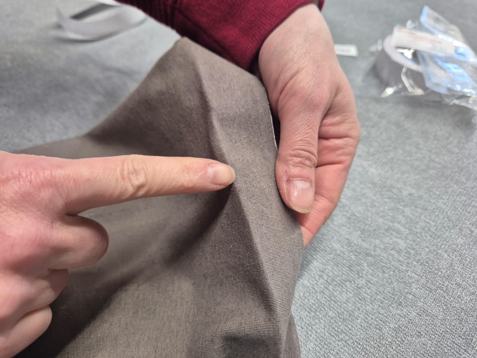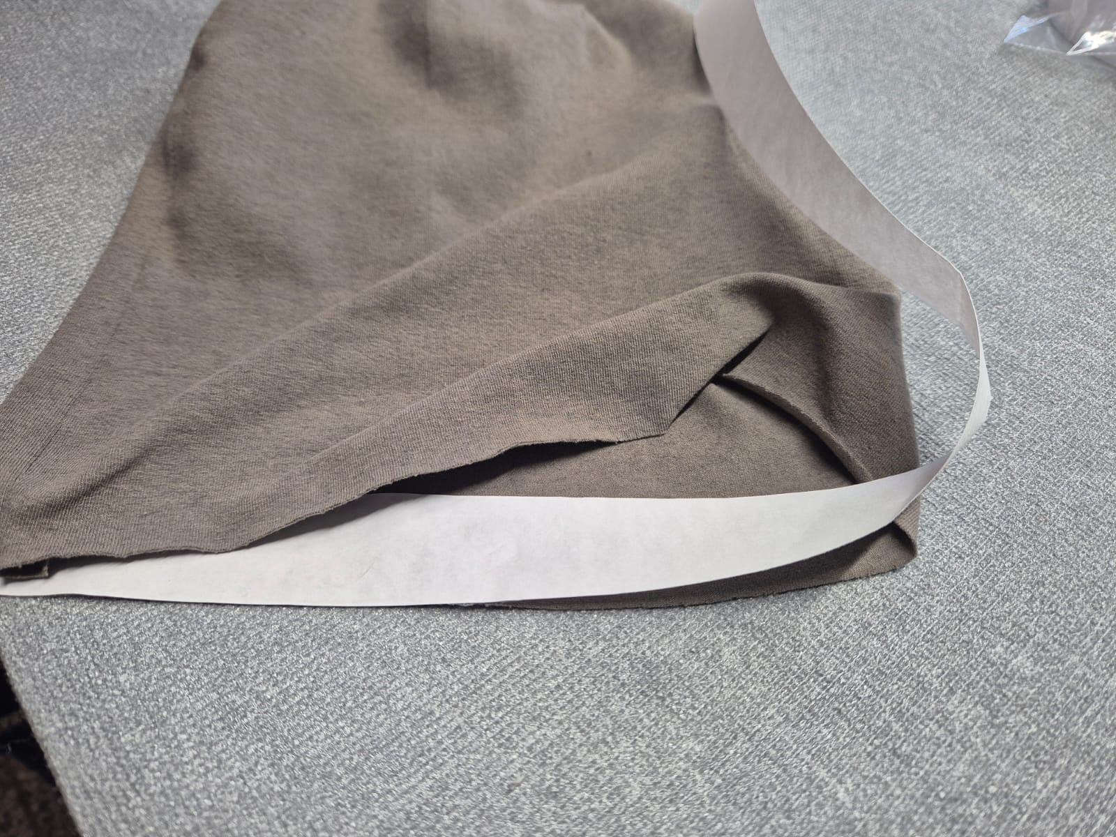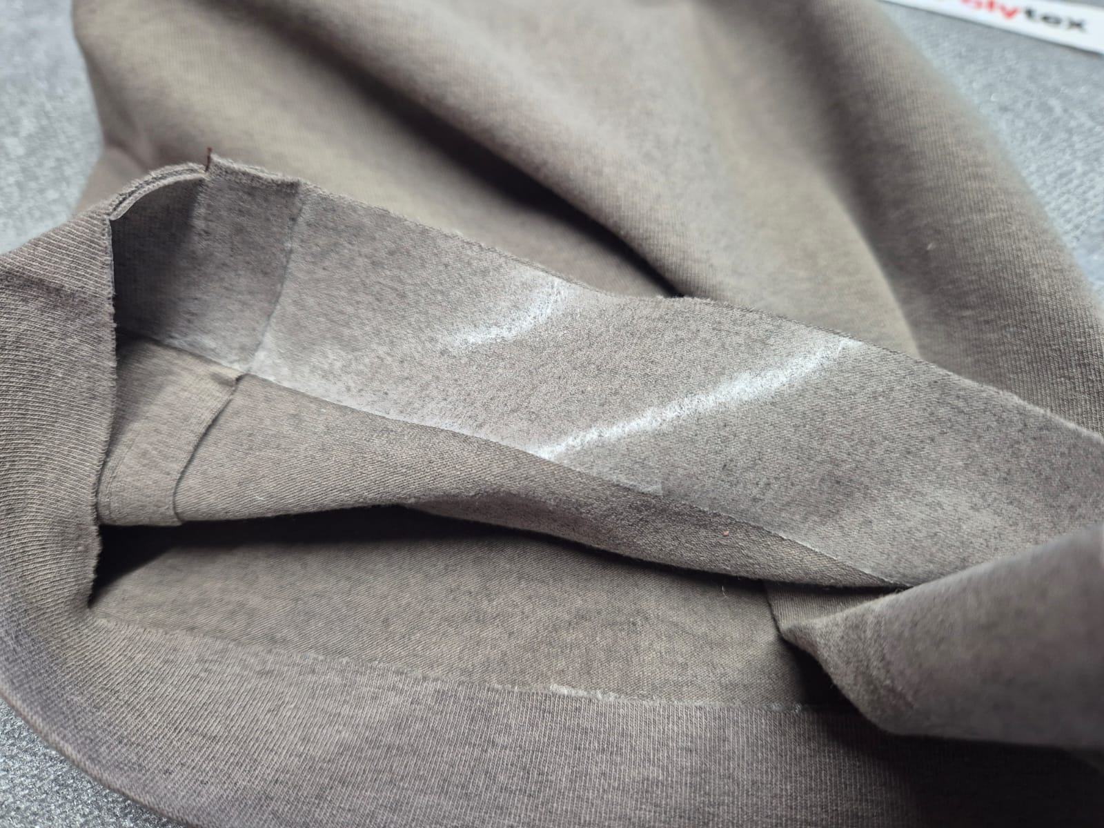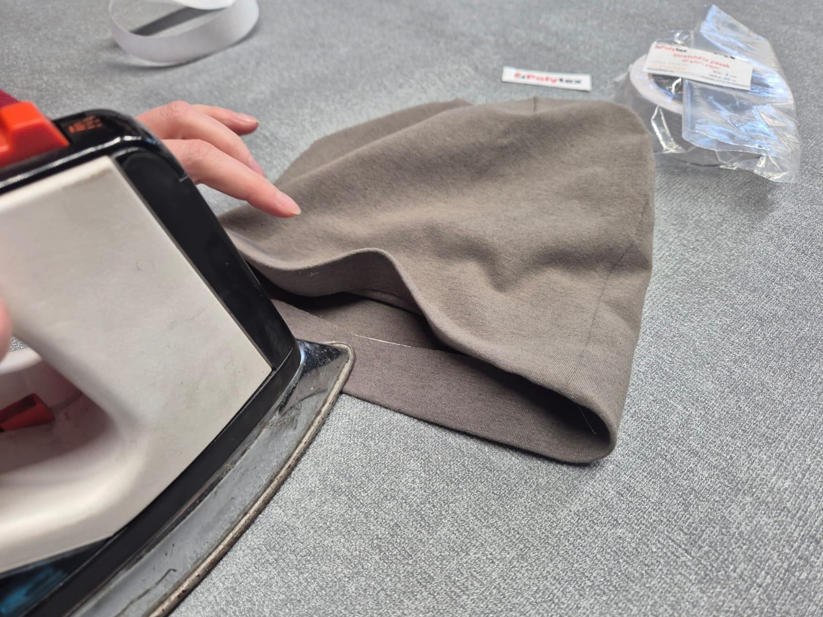 Použijeme k tomu speciální, elastickou, oboustranně zažehlovací pavučinku, která zajistí čistý, plochý a neviditelný spoj, aniž by látka ztratila svou pružnost. Jmenuje se Stretchfix.