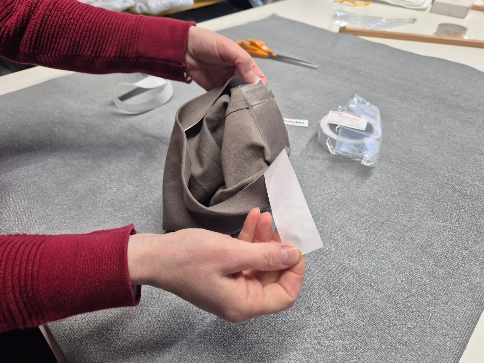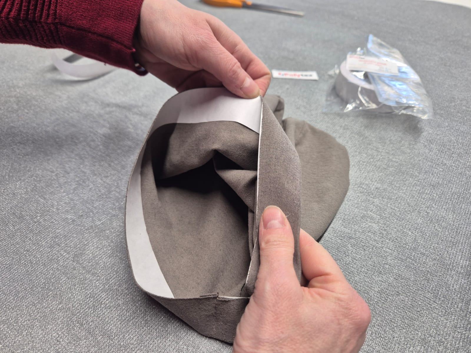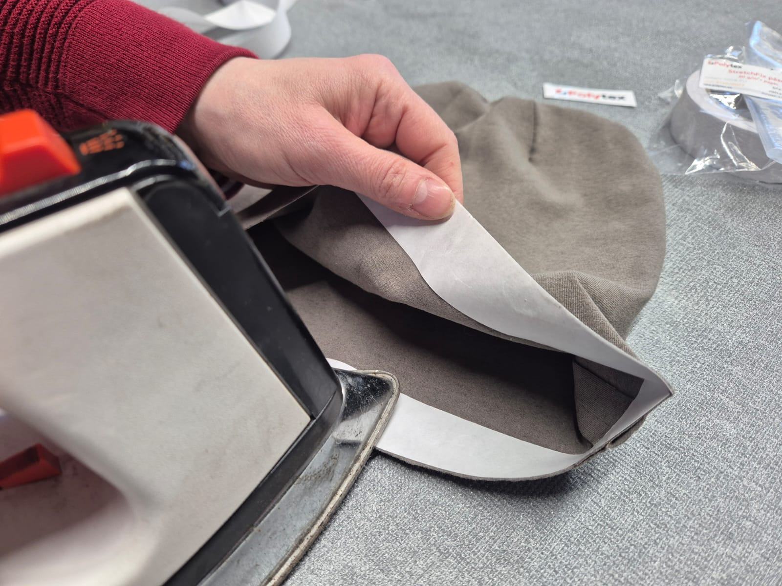 Zvolíme si šířku pásky podle toho, o kolik budeme kraj zakládat. Jak moc velký máte přídavek. V našem případě máme šířku 3 cm. Přiložíme kraj pásky k vnitřnímu kraji čepice, tak aby páska měla nosný papír nahoře. Přes něj můžeme pásku k čepici nažehlovat.